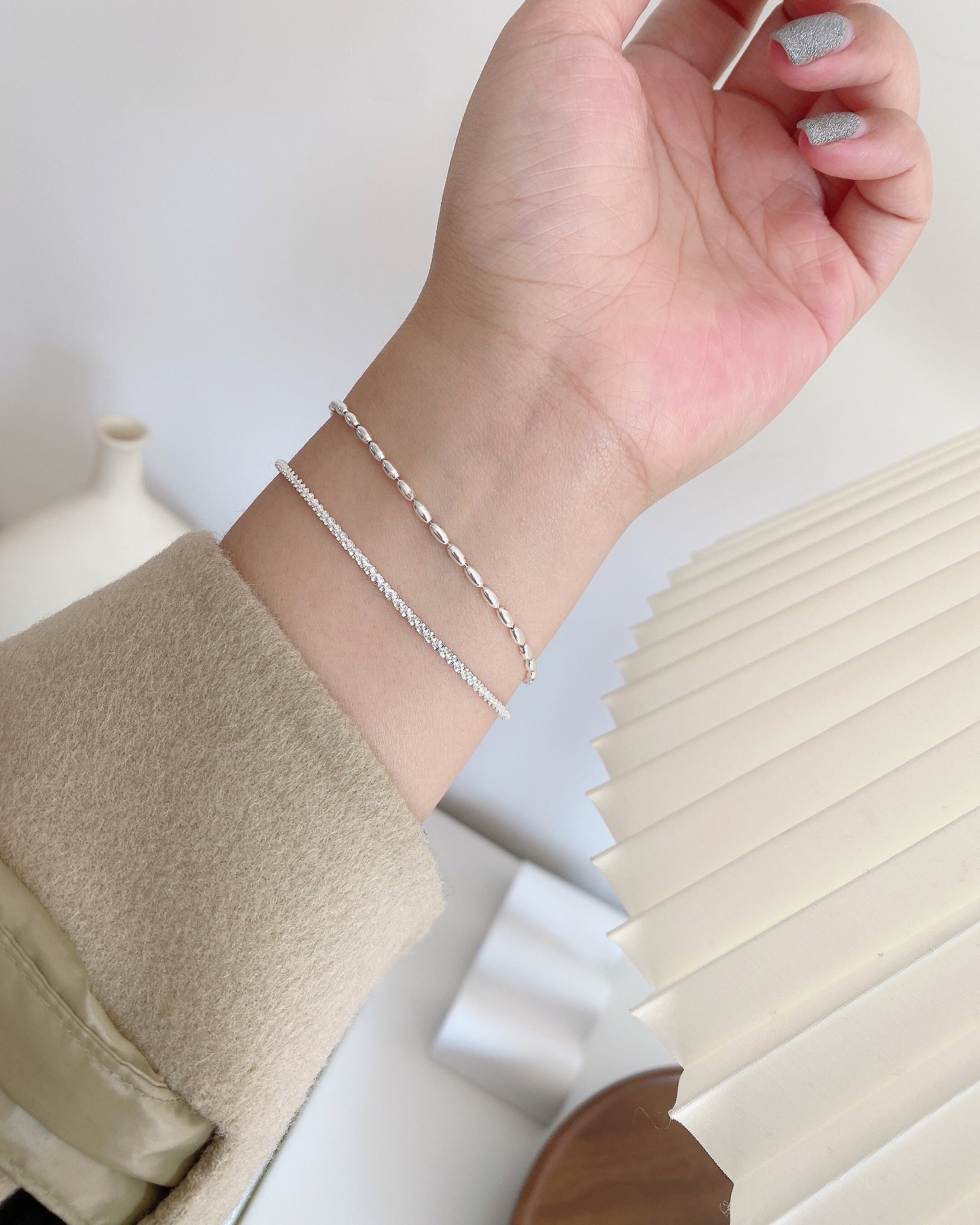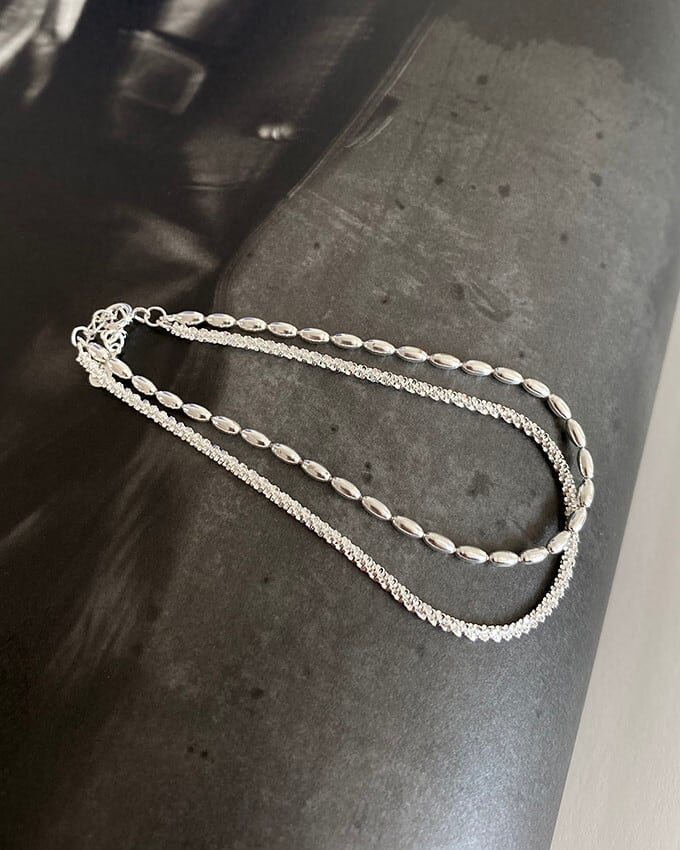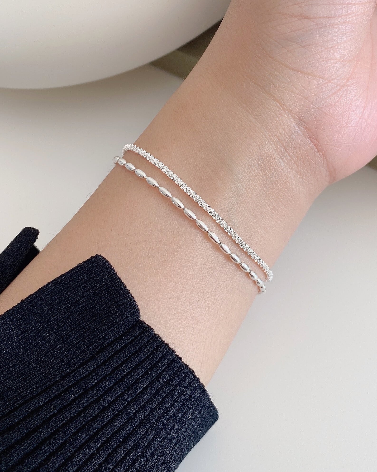 チェーンとシルバービーズの2連ブレスレット。