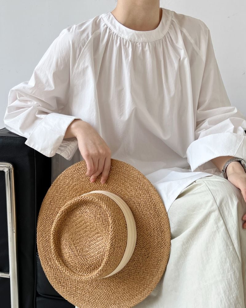 クルーネックのギャザーがアクセントのAラインブラウス。 ネック・カフス・裾のデティールがこなれ感を演出してくれます。 Aラインシルエットで身体のラインは拾いにくく、一枚で様になるブラウスです。 *モデル身長166cm/着用サイズM 【Size】 M 胸囲136cm/袖丈69cm/裾140cm/着丈81cm L 胸囲140cm/袖丈70cm/裾141cm/着丈82cm 【Color】 White/Yellow/Black 【Material】 綿100% ■お届けについて こちらの商品は海外より直接発送となる為、ご入金から2~4週間前後で発送致します。 (タイミングによっては 商品在庫切れにより注文キャンセルとさせていただく恐れもございますので、予めご了承くださいませ。) ■注意事項 ・手作業による計測のため実際のサイズと1~3cm程度の誤差がある場合がございます。 ・こちらは海外製品のため縫製が甘いことやしわがついていることがありますが、重大な不良品に該当しない場合返品対象外となります。 ・仕入れ工場が変更になることがあるため、商品の使用が若干異なる場合がございます。 ・商品写真は照明やお使いのスクリーンの設定によって実物の素材感や色味とは違って見える場合がございます。 ・イメージ違いやサイズ交換等、お客様都合による返品・交換は原則承っておりません。 ---------------- ご購入前にこちらをお読みください https://leonie.official.ec/about ------------------------ 新作などその他の商品はTOPページをご覧ください https://leonie.official.ec/ ------------------------ 人気の商品を集めたHOTアイテムはこちら https://leonie.official.ec/categories/4475668 ------------------------