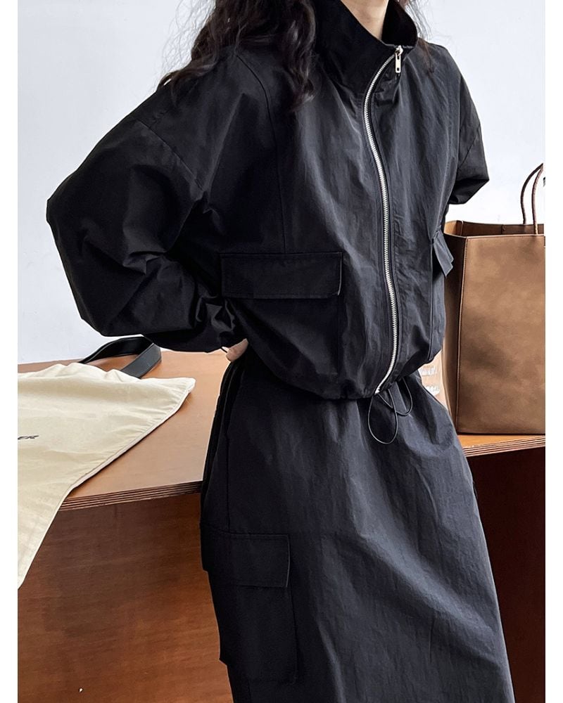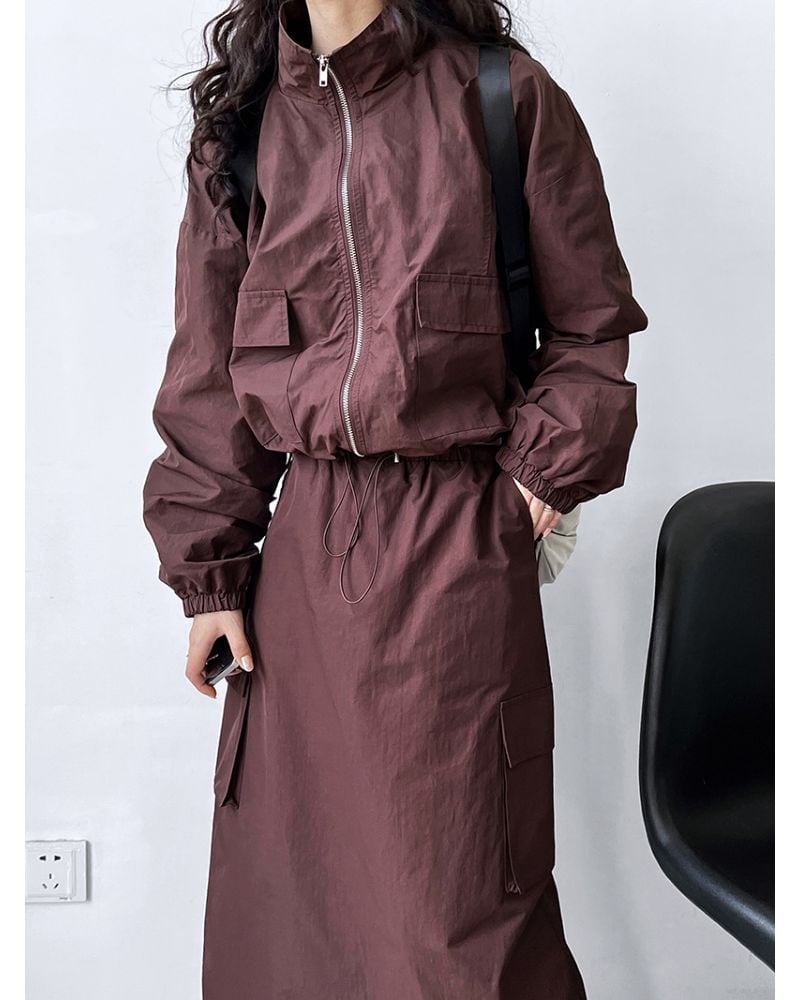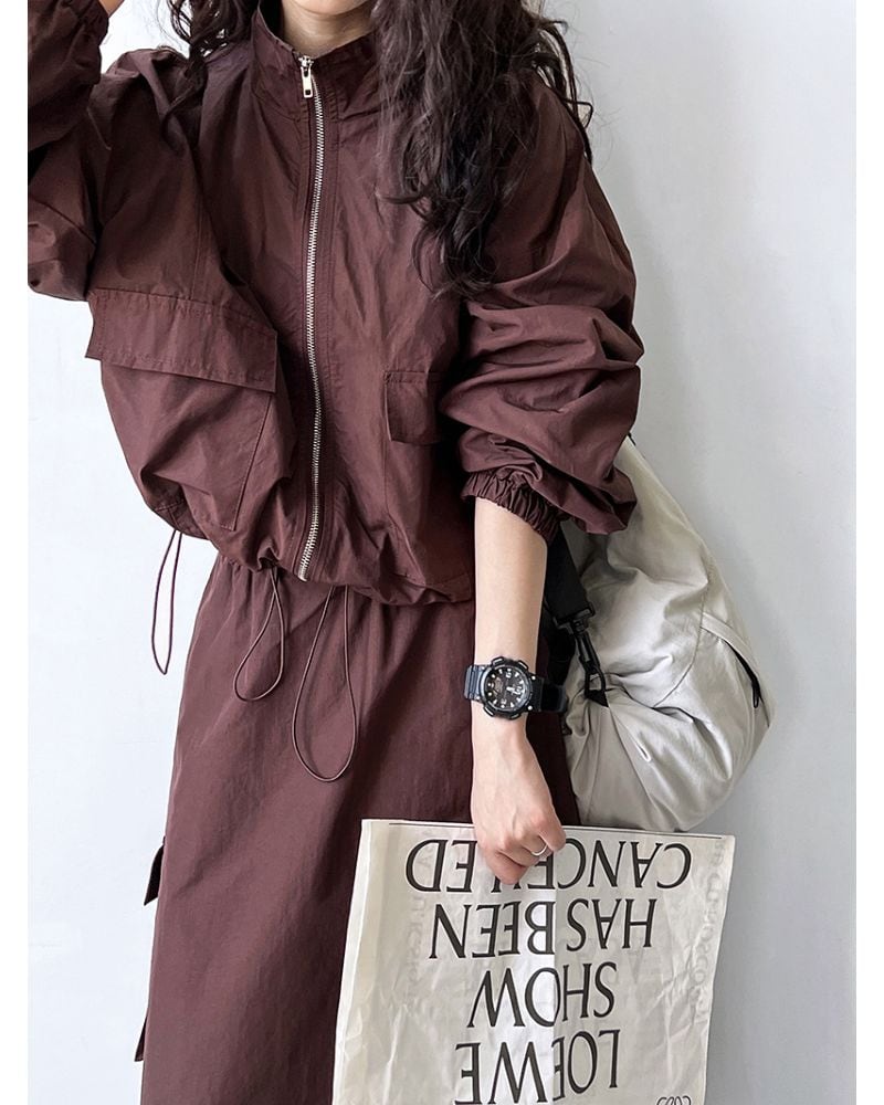 *モデル身長166cm/着用サイズM 【Size】 Blouson M 肩幅64cm/胸囲128cm/袖丈54cm/裾周り80-128cm/着丈52cm L 肩幅66cm/胸囲132cm/袖丈55cm/裾周り84-132cm/着丈53cm Skirt M ウエスト66cm/ヒップ98cm/総丈88cm L ウエスト70cm/ヒップ102cm/総丈89cm 【Color】 Wine/Khaki/Black 【Material】 綿55%/ナイロン45% ■お届けについて こちらの商品は海外より直接発送となる為、ご入金から2~4週間前後で発送致します。 (タイミングによっては 商品在庫切れにより注文キャンセルとさせていただく恐れもございますので、予めご了承くださいませ。) ■注意事項 ・手作業による計測のため実際のサイズと1~3cm程度の誤差がある場合がございます。 ・こちらは海外製品のため縫製が甘いことやしわがついていることがありますが、重大な不良品に該当しない場合返品対象外となります。 ・仕入れ工場が変更になることがあるため、商品の使用が若干異なる場合がございます。 ・商品写真は照明やお使いのスクリーンの設定によって実物の素材感や色味とは違って見える場合がございます。 ・イメージ違いやサイズ交換等、お客様都合による返品・交換は原則承っておりません。 ---------------- ご購入前にこちらをお読みください https://leonie.official.ec/about ------------------------ 新作などその他の商品はTOPページをご覧ください https://leonie.official.ec/ ------------------------ 人気の商品を集めたHOTアイテムはこちら https://leonie.official.ec/categories/4475668 ------------------------